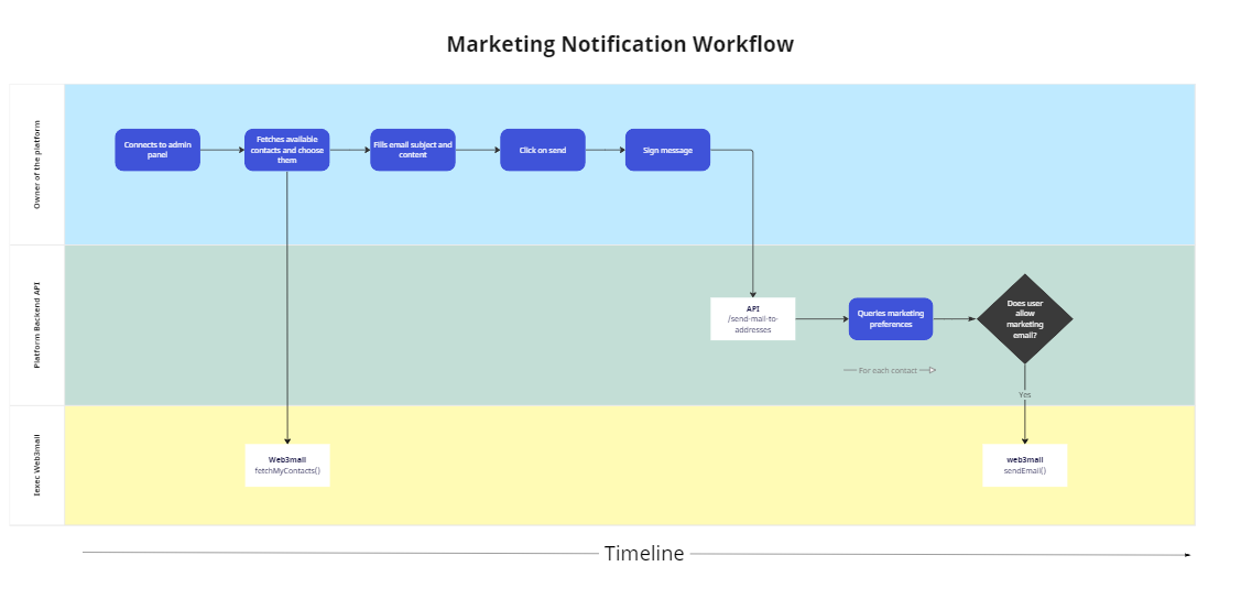 Notifications campaigns which will be sent on a non-programmed manner will be sent using the "sendEmail" function of the Web3Mail provider. The only checks to be done is whether the user granted access to his email to the platform & whether the user opted for this feature.