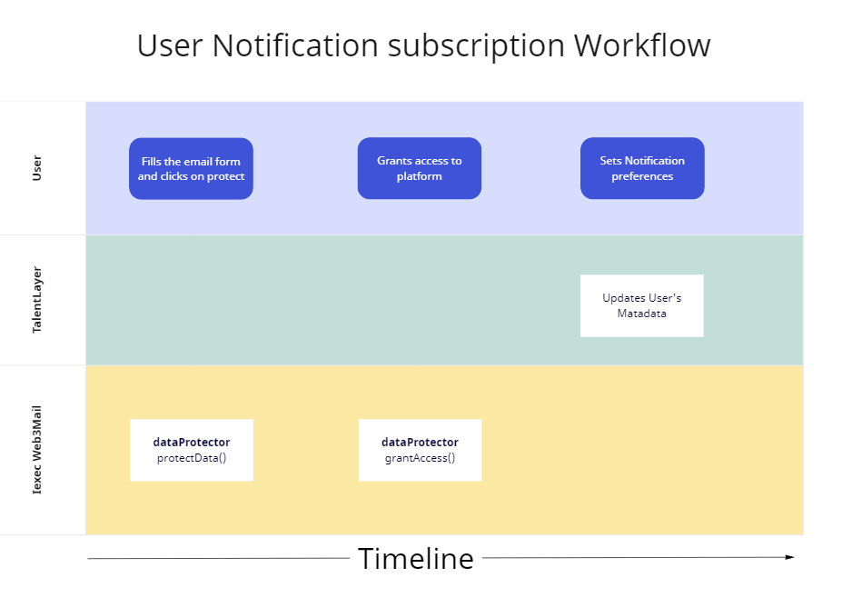 In order to receive email notifications, the user first has to protect (encrypt) his email using Iexec's DataProtector. Then he will grant access to his encrypted email to a platform (represented by the Ethereum Address of the platform's owner). This allows a platform to send any email to this user. The user can revoke this access at any time.