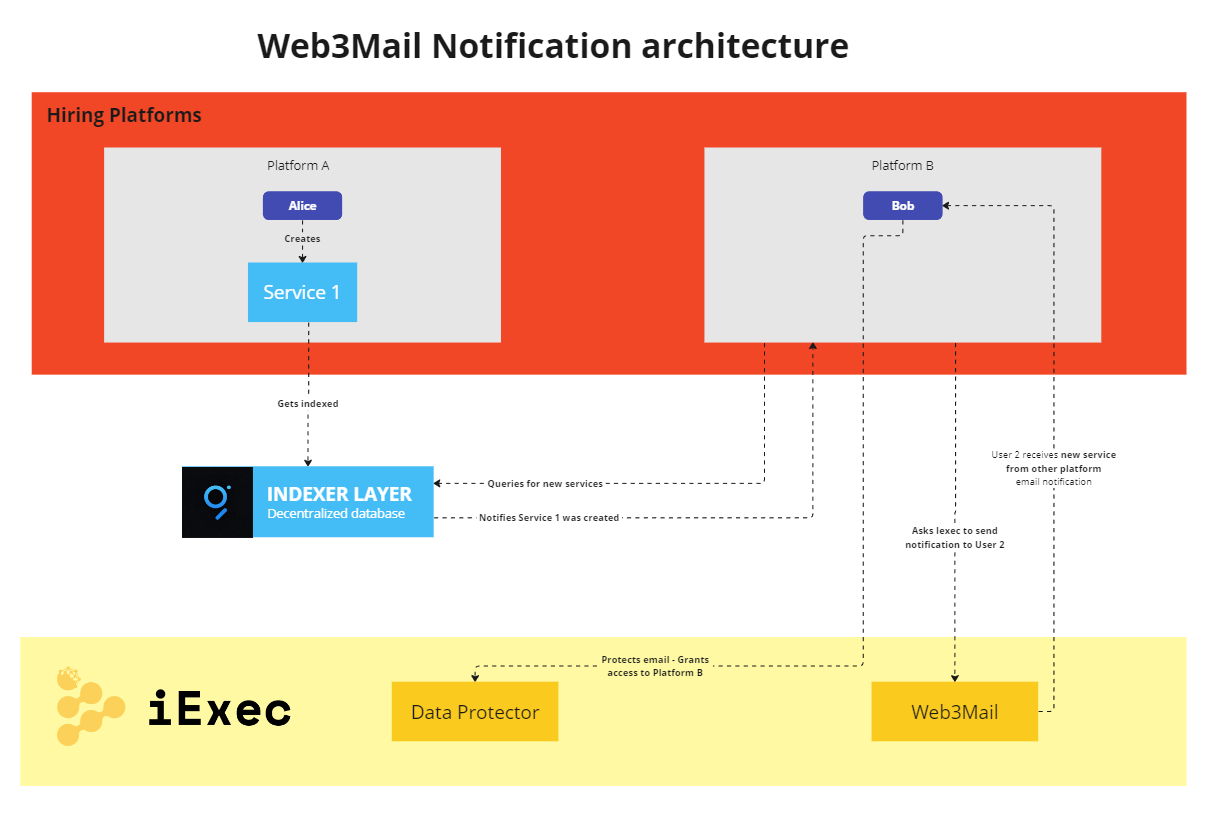 <figure><img src="https://1292612581-files.gitbook.io/~/files/v0/b/gitbook-x-prod.appspot.com/o/spaces%2FLxwTmt3MOuMIlBTH8NKY%2Fuploads%2FmGfEKbVIdxUcqzjt6l2b%2Fimage.png?alt=media&#x26;token=fe27f48f-3b3d-40aa-a841-86c3994132a9" alt=""><figcaption><p>Web3mail architecture - New Service notification example</p></figcaption></figure>